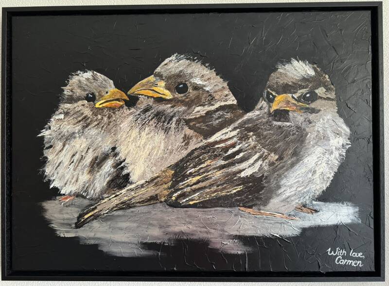 3 musjes, acrylverf, 50 x 70 cm. Te koop voor 275,= incl. lijst.